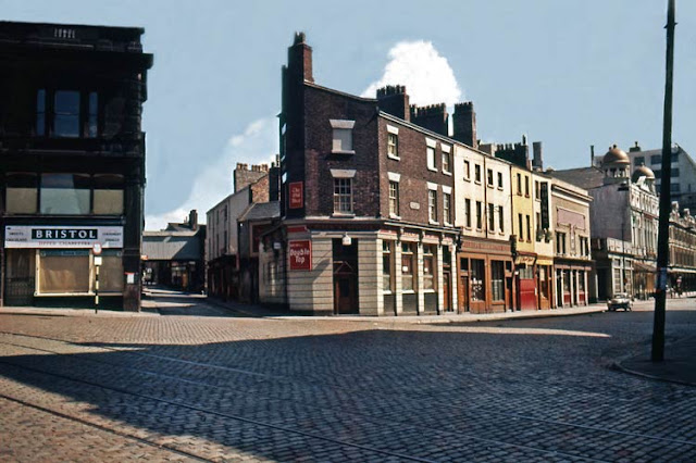 A photo from the always excellent Facebook page Liverpool:Then and Now by Keith Jones. Photographed from Williamson Square, the Old Royal pub at the start of Brythen Street is visible to the left of the Playhouse Theatre in the early 1960s photo.