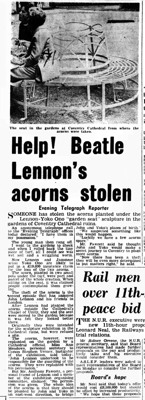 The bench and acorns had been moved about 50-feet to the Cathedral's gardens. Pegan was quoted as saying ‘the Lennon-Yono (sic) piece is very good – but only as a garden seat and is being used as such by visitors’. Another member of the Cathedral staff noted that fans had already stolen the plaque.